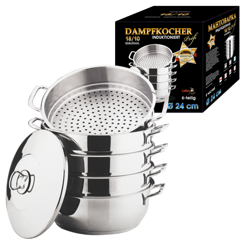 Диаметр 24 см, высокое качество, индукционная Мантоварка - это та же пароварка. Давно известно, что пища приготовленная на пару является не только вкусной, но наиболее полезной, т.к. сохраняет почти все полезные свойства продуктов, а это необходимо для каждого человека во все времена года. В мантоварке можно приготовить не только манты, но и другие блюда, причем, (в зависимости от количества секций), до четырех блюд одновременно. Также, ее можно использовать как обычную кастрюлю. Хорошее качество и хороший подарок для ваших близких.