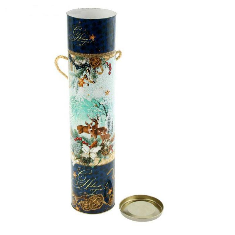 Эффектная новогодняя упаковка в виде картонного тубуса с крышечкой из золотистого металла с яркой картинкой создаст праздничное настроение владельцу презента.