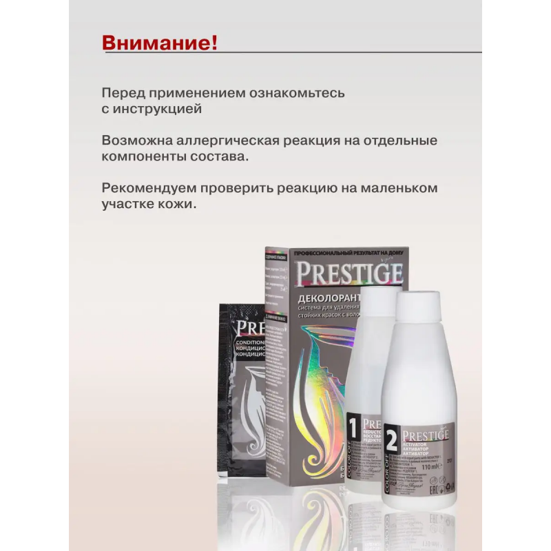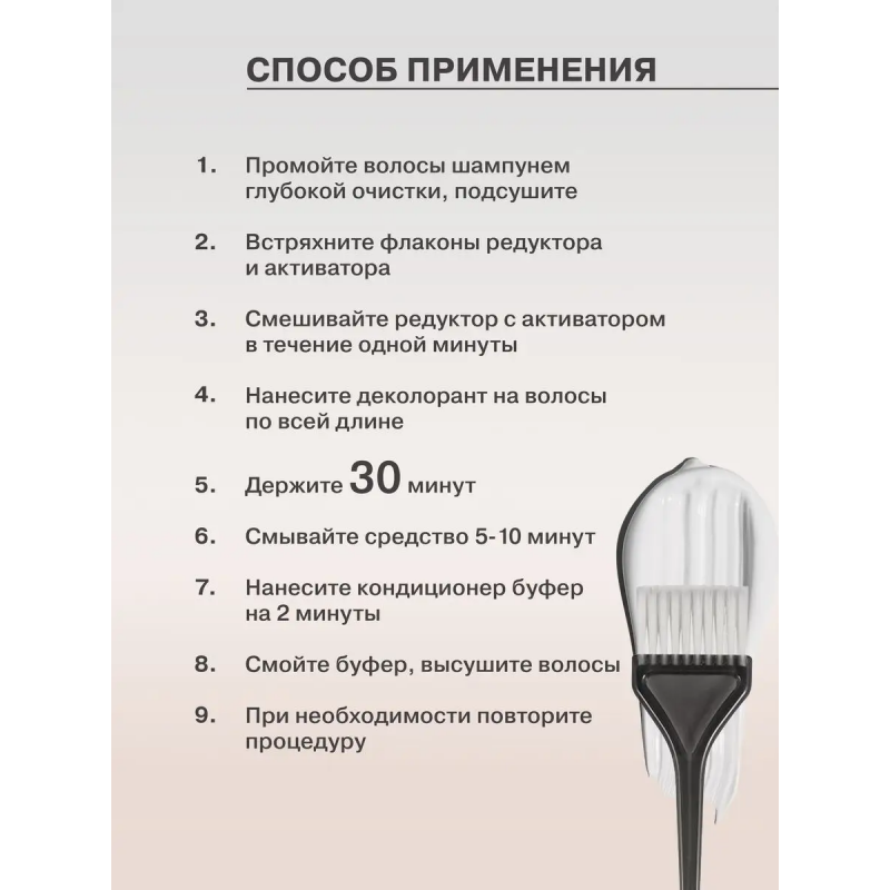 La confezione contiene 1 flacone di decolorante (110ml), 1 confezione di attivatore (110ml), 1 bustina di balsamo, istruzioni d'uso, guanti protettivi. Attenzione! Non utilizzare su irritazioni o ferite. Effettuare il test della sensibilità su una piccola zona prima dell'utilizzo. Evitare il contatto con gli occhi; in caso di contatto con gli occhi sciacquare immediatamente. Utilizzare i guanti protettivi e seguire attentamente le istruzioni d'uso. Possibile reazione allergica in caso di intolleranza individuale del prodotto. Tenere fuori dalla portata dei bambini. Chiudere il prodotto dopo l'utilizzo, senza scambiare i tappi. Contiene methylizothiazolinone.