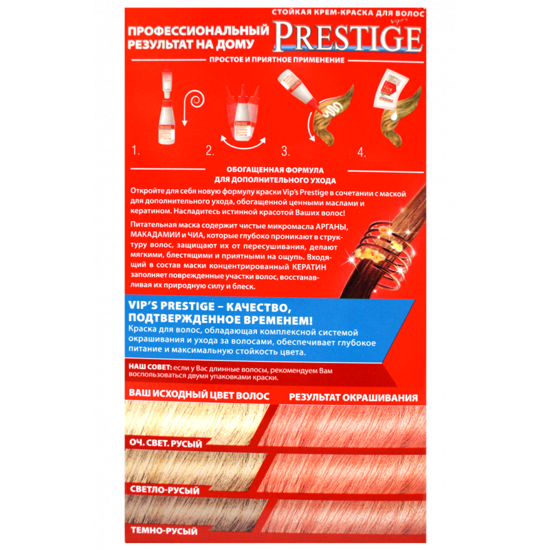 VIPs Prestige è la nuova formula arricchita di uno speciale complesso di vitamine e proteine di frumento che proteggono i capelli danneggiati. Dopo la tintura di tuoi capelli avranno una vita sana e più essenziale. Ease parrucchiere.