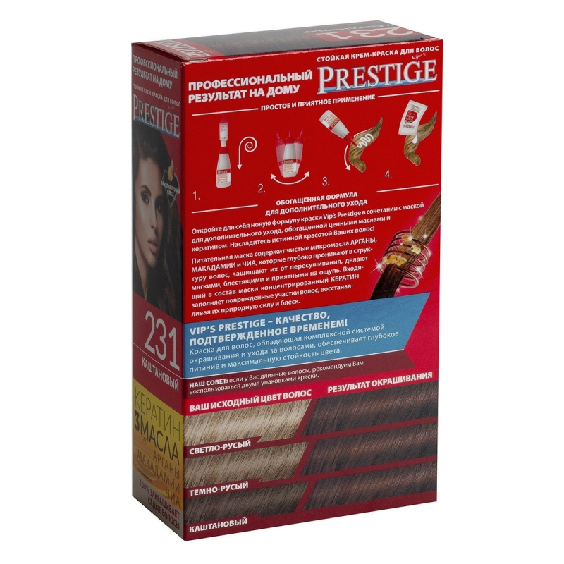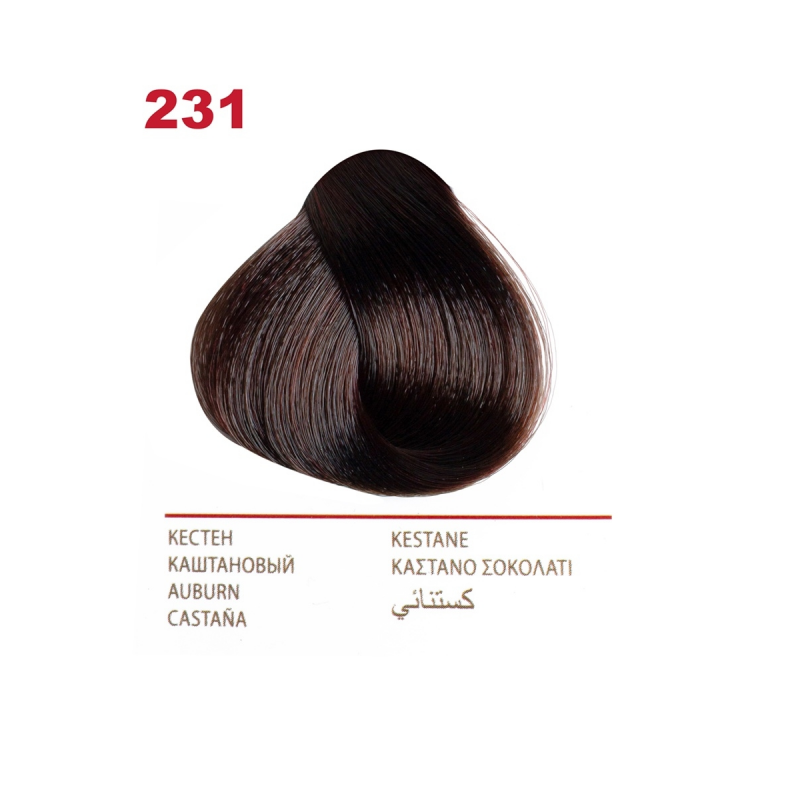 Crema Colorante per capelli, 231 Castano, con uno speciale complesso di proteine di grano, vitamina C e F. Contenuto della confezione: 1 tubetto di crema da 50 ml; 1 flacone ossidante da 50 ml; 1 sacchetto di balsamo per capelli tinti da 15 ml; 1 guanto da 1; Crema - Ossidante 1:1