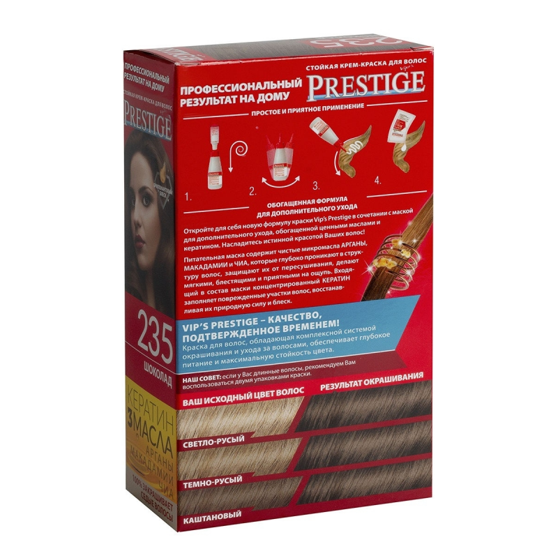 Crema Colorante per capelli, 235 Cioccolato, con uno speciale complesso di proteine di grano, vitamina C e F. Contenuto della confezione: 1 tubetto di crema da 50 ml; 1 flacone ossidante da 50 ml; 1 sacchetto di balsamo per capelli tinti da 15 ml; 1 guanto da 1; Crema - Ossidante 1:1