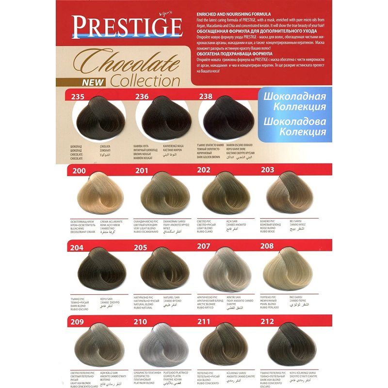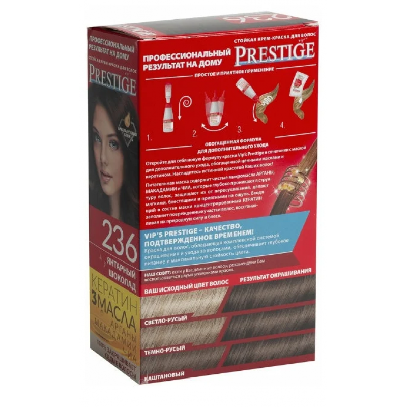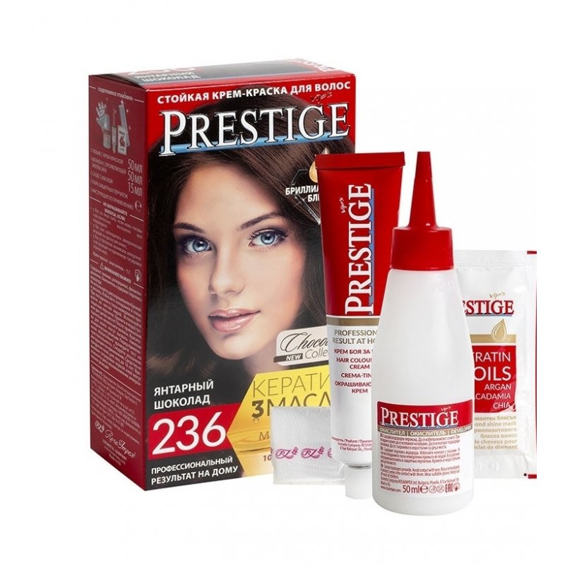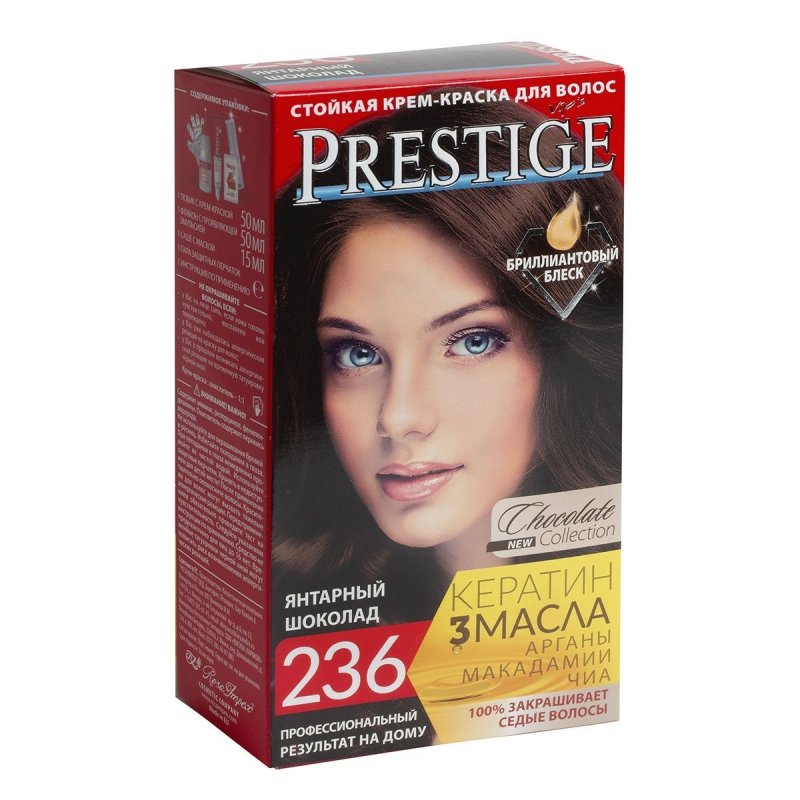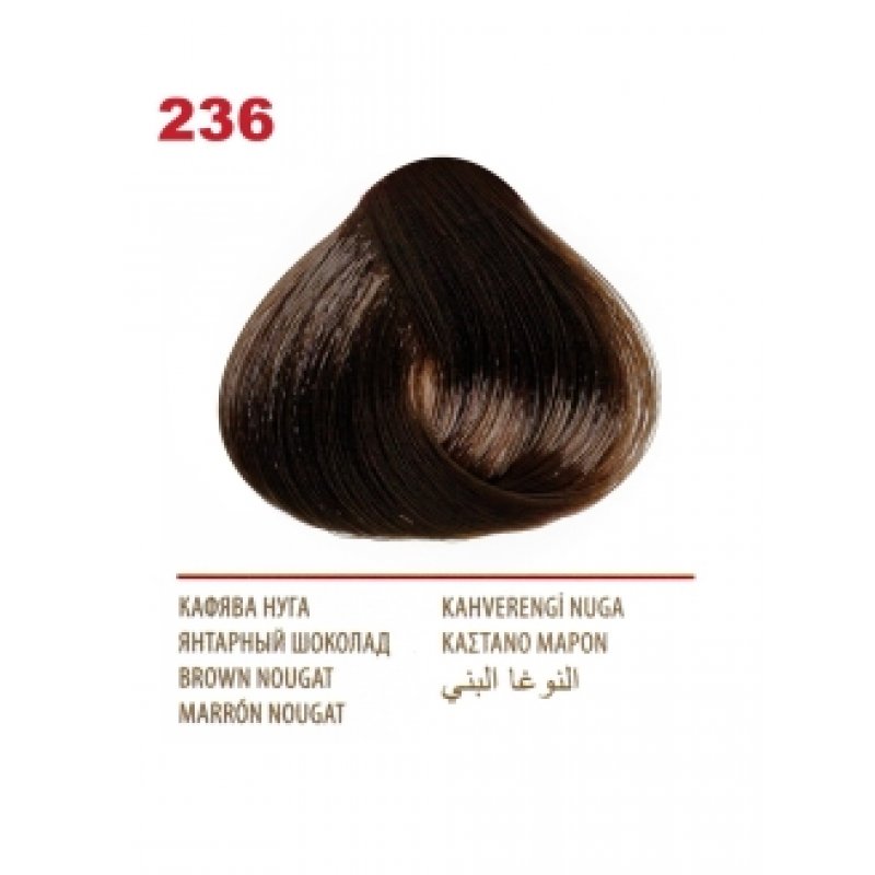Crema Colorante per capelli, 236 Ambra cioccolato, con uno speciale complesso di proteine di grano, vitamina C e F. Contenuto della confezione: 1 tubetto di crema da 50 ml; 1 flacone ossidante da 50 ml; 1 sacchetto di balsamo per capelli tinti da 15 ml; 1 guanto da 1; Crema - Ossidante 1:1